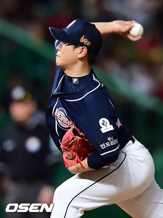 5일 오후 인천 문학야구장에서 열린 2014 한국야쿠르트 세븐 프로야구 SK 와이번스와 두산베어스의 경기, 6회말 마운드에 오른 두산 윤명준이 힘차게 공을 뿌리고 있다.