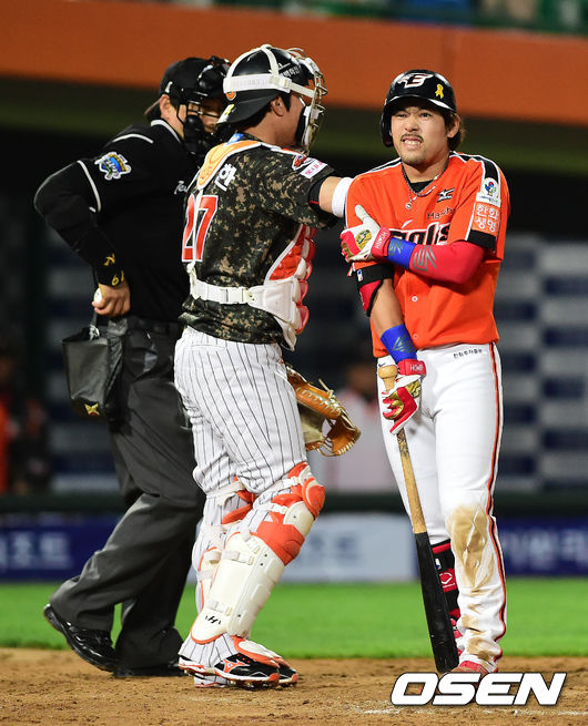 8회초 2사 1루에서 한화 이용규가 롯데 정대현의 투구에 맞고 괴로워하고 있다.