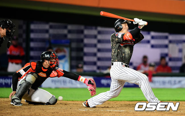 8회말 2사 1루에서 사이클링 히트에 홈런만을 남겨둔 롯데 손아섭이 헛스윙을 하고 있다.