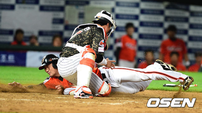 홈에서 태그아웃당하는 송광민, '이걸로 끝'