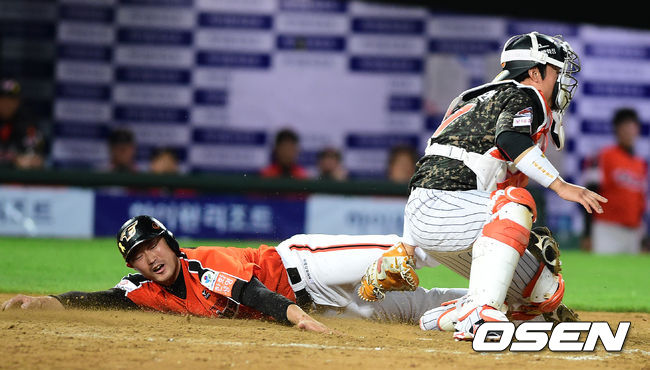 9회초 1사 1,3루에서 한화 송광민이 최진행의 투수 앞 땅볼에 홈에서 롯데 용덕한에 태그아웃 당하고 있다./jpnews@osen.co.kr