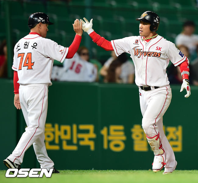5일 오후 인천 문학야구장에서 열린 2014 한국야쿠르트 세븐 프로야구 SK 와이번스와 두산베어스의 경기, 7회말 2사 SK 김강민이 좌월 솔로 홈런을 날린 후 3루에서 조원우 코치와 하이파이브를 하고 있다.