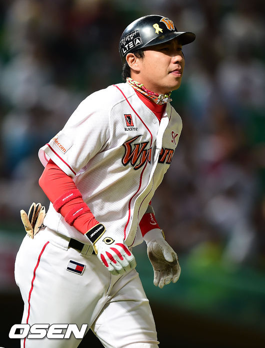 5일 오후 인천 문학야구장에서 열린 2014 한국야쿠르트 세븐 프로야구 SK 와이번스와 두산베어스의 경기, 7회말 2사 SK 김강민이 좌월 솔로 홈런을 날린 후 달려나오고 있다.