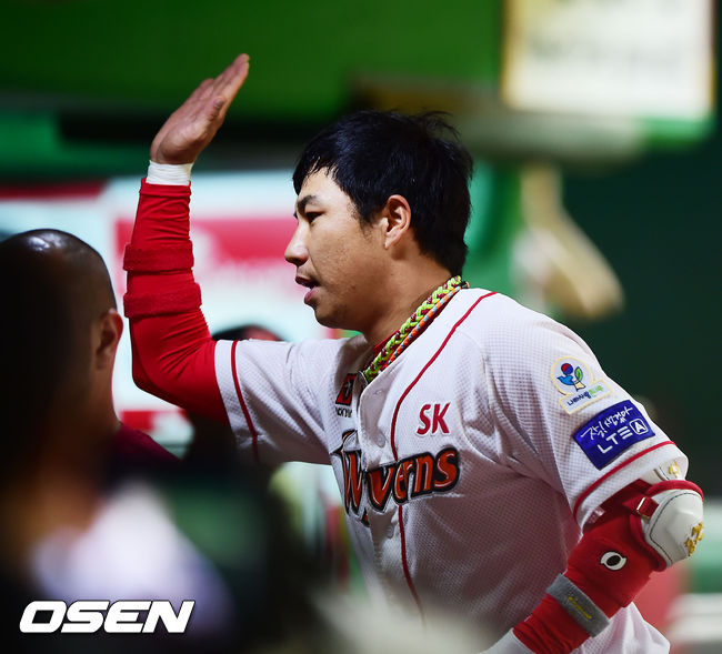 5일 오후 인천 문학야구장에서 열린 2014 한국야쿠르트 세븐 프로야구 SK 와이번스와 두산베어스의 경기, 7회말 2사 SK 김강민이 좌월 솔로 홈런을 날린 후 덕아웃에서 동료들과 하이파이브를 하고 있다.