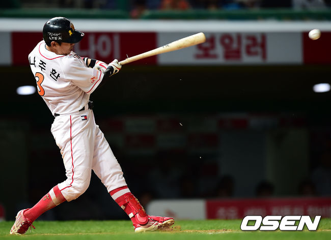 5일 오후 인천 문학야구장에서 열린 2014 한국야쿠르트 세븐 프로야구 SK 와이번스와 두산베어스의 경기, 8회말 무사 주자 2루 SK 나주환이 좌익수 앞 1타점 적시타를 날리고 있다.