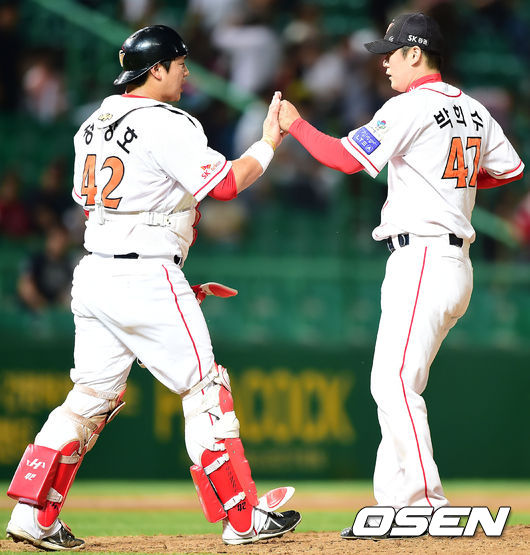 경기를 마치고 SK 정상호와 박희수가 하이파이브를 하고 있다. / rumi@osen.co.kr