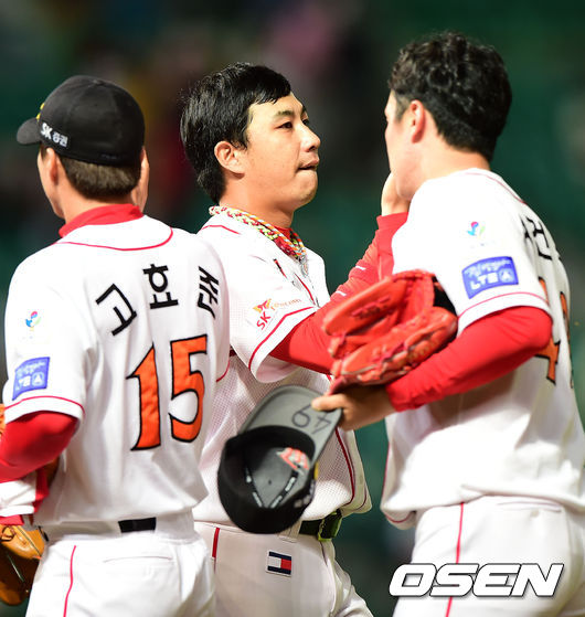 경기를 마치고 SK 김강민이 동료들과 하이파이브를 하고 있다. / rumi@osen.co.kr