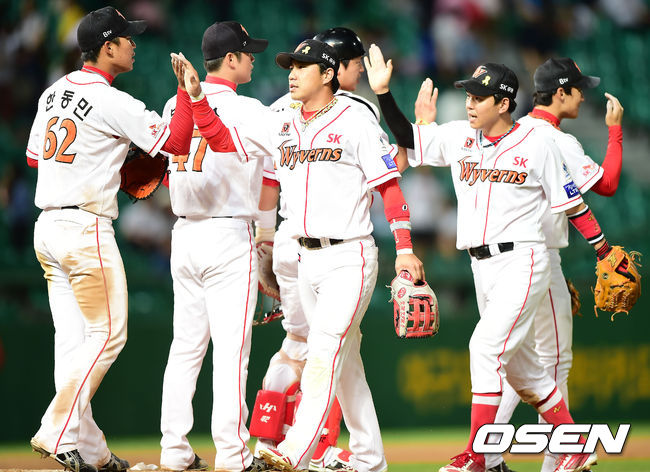 경기를 마치고 SK 선수들이 마운드 근처에서 하이파이브를 하고 있다. / rumi@osen.co.kr