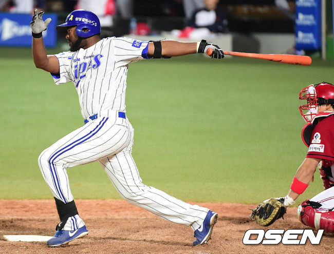 9회말 삼성 공격 2사 3루 상황 나바로가 동점 좌전 적시타를 날리고 있다.