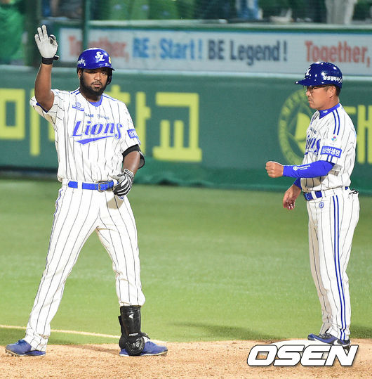 9회말 삼성 공격 2사 3루 상황 나바로가 동점 좌전 적시타를 날리고 1루에 안착한 뒤 팬들의 환호에 답하고 있다.