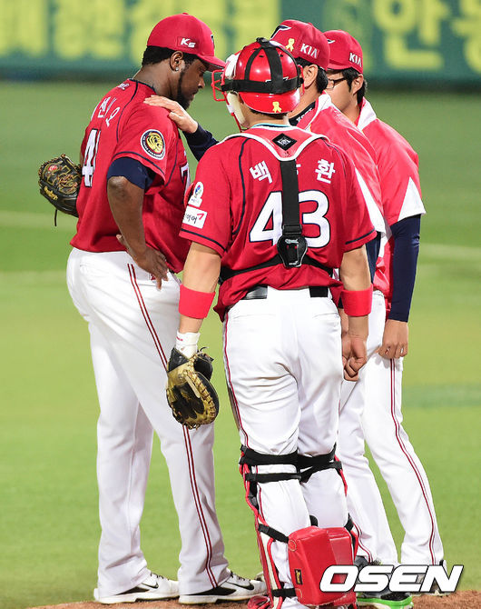 연장 10회말 무사 1, 2루 상황 이승엽 타석 때 KIA 마무리투수 어센시오가 강판되고 있다.