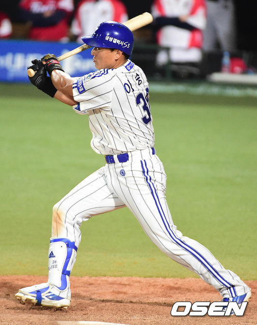 연장 10회말 삼성 공격 무사 1, 2루 상황 이승엽이 적시 1타점 2루타를 날리고 있다.