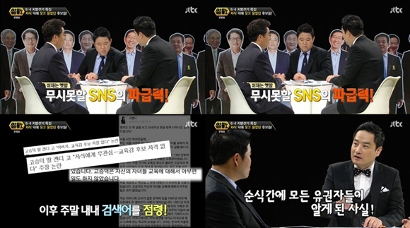 이어 강용석은 "그런데 이번에는 SNS를 통해서"라며 "하루 만에 다 알려지고 기사화되면서 순식간에 유권자들이 모두 알게 됐다. 예전에는 이렇게 빨리 알려지는 경우가 없었다"라고 덧붙여 눈길을 끌었다.