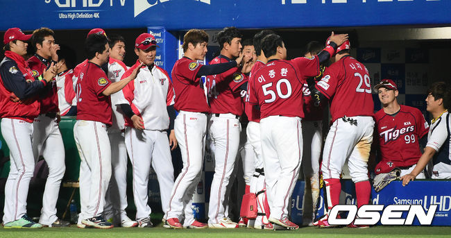 연장 11회초 KIA 공격 선두타자로 나선 나지완이 앞서가는 좌월 솔로포를 날리고 더그아웃 동료들과 인사를 나누고 있다.