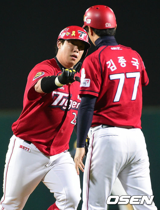 연장 11회초 KIA 공격 선두타자로 나선 나지완이 앞서가는 좌월 솔로포를 날리고 그라운드를 돌며 김종국 코치와 인사를 나누고 있다.