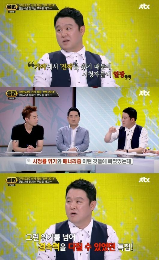 지난 5일 방송된 JTBC ‘썰전’에서는 MBC ‘무한도전’ 선거특집을 두고 ‘왜 대중은 가짜 정치에 열광할까’란 주제로 이야기를 나눴다.