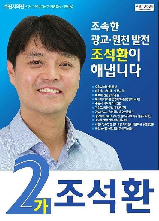 조석환 당선자는 새정치민주연합의 공천을 받아 이번 지방선거로 정치에 발을 들였고, 수원시의회의원 선거에 출마해 35.43%의 득표율로 당선됐다.