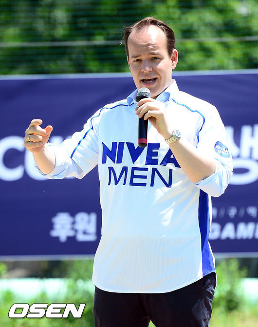 6일 오전 경기도 연천 베이스볼파크에서 진행된 '제5회 니베아맨 컵 전국 생활체육인 야구대회' 개막식에 참석한 바이어스도르프 한국지사장 코넬리우스 베커가 축사를 하고 있다.