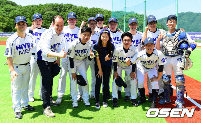 6일 오전 경기도 연천 베이스볼파크에서 진행된 '제5회 니베아맨 컵 전국 생활체육인 야구대회' 개막식에 참석한 바이어스도르프 한국지사장 코넬리우스 베커와 김유정이 니베아 맨 선수들과 기념촬영을 하고 있다.