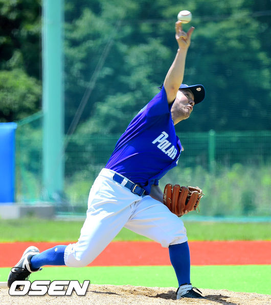 6일 오전 경기도 연천 베이스볼파크에서 진행된 '제5회 니베아맨 컵 전국 생활체육인 야구대회' 폴라베어스와 니베아맨의 경기, 4회초 폴라베어스 이광일이 힘차게 공을 뿌리고 있다.