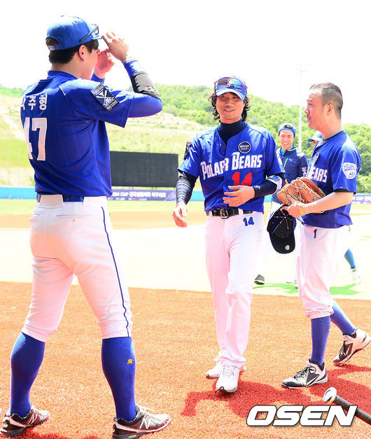 6일 오전 경기도 연천 베이스볼파크에서 진행된 '제5회 니베아맨 컵 전국 생활체육인 야구대회' 폴라베어스와 니베아맨의 경기종료 후, 승리한 폴라베어스 박승화 구단주와 이광일이 미소짓고 있다.