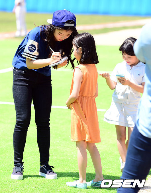 6일 오전 경기도 연천 베이스볼파크에서 진행된 '제5회 니베아맨 컵 전국 생활체육인 야구대회' 개막식에 참석한 김유정이 어린이팬들에게 사인을 해주고 있다.