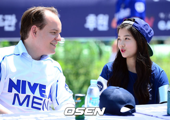 6일 오전 경기도 연천 베이스볼파크에서 진행된 '제5회 니베아맨 컵 전국 생활체육인 야구대회' 개막식에서 바이어스도르프 한국지사장 코넬리우스 베커와 김유정이 이야기를 나누고 있다.