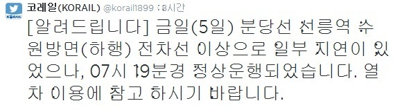 코레일에 따르면 5일 오전 6시 34분경 선릉역에서 분당 방면으로 향하려던 전동차 지붕의 애자(전기절연장치)가 일시적인 고전압으로 파손됐다.