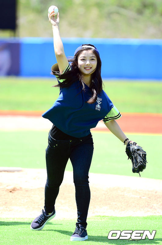위에서부터 멋진 투구 폼으로 시구를 하고 있는 김유정, 폴라베어스의 주득점원인 송호범의 타격 장면. 그리고 시구자인 김유정을 마운드까지 에스코트 한 뒤 시구를 지켜보고 있는 코넬리우스 베커 바이어스도르프 한국 지사장. /정송이 기자 ouxou@osen.co.kr