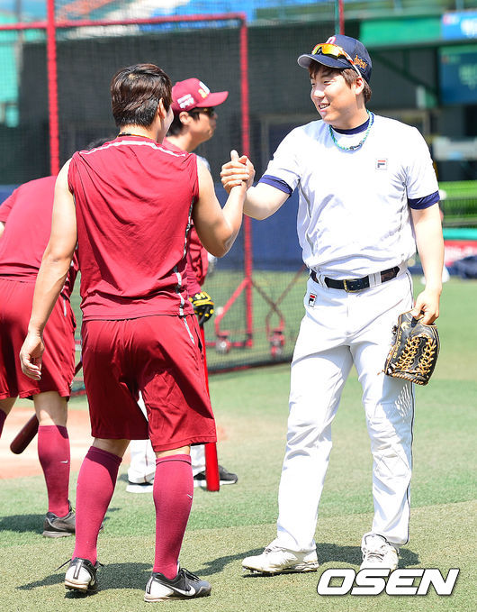 6일 오후 서울 목동구장에서 열리는 '2014 한국야쿠르트 세븐 프로야구' 넥센 히어로즈와 두산 베어스의 경기를 앞두고, 넥센 강정호와 두산 김현수가 인사를 나누고 있다.