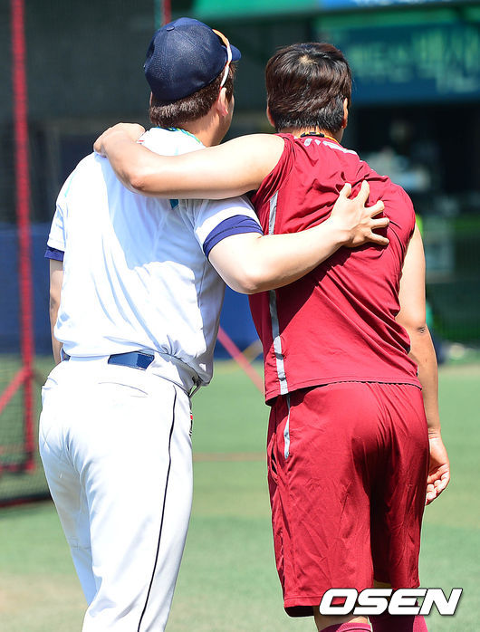 6일 오후 서울 목동구장에서 열리는 '2014 한국야쿠르트 세븐 프로야구' 넥센 히어로즈와 두산 베어스의 경기를 앞두고, 넥센 강정호와 두산 김현수가 인사를 나누고 있다.