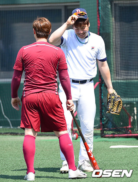 6일 오후 서울 목동구장에서 열리는 '2014 한국야쿠르트 세븐 프로야구' 넥센 히어로즈와 두산 베어스의 경기를 앞두고, 넥센 윤석민과 두산 김현수가 인사를 나누고 있다.