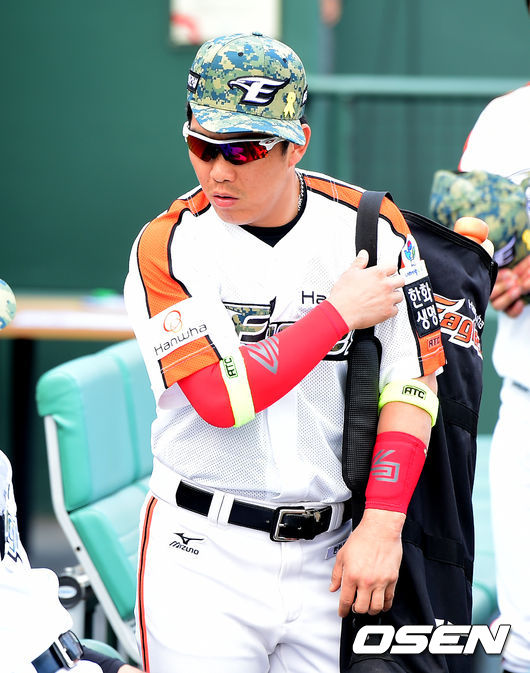 경기에 앞서 한화 정근우가 더그아웃에서 경기를 준비하고 있다.