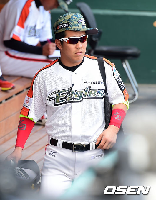 경기에 앞서 한화 정근우가 더그아웃에서 경기를 준비하고 있다.