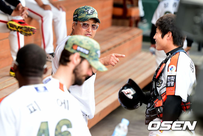 경기에 앞서 한화 조인성이 피에와 이야기를 나누고 있다.