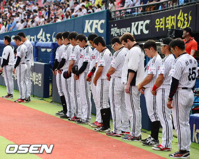 6일 오후 서울 잠실야구장에서 열린 2014 한국야쿠르트 세븐 프로야구 LG 트윈스와 KIA 타이거즈의 경기, 경기 전 세월호 희생자들과 순국 선열들을 위한 묵념이 진행되고 있다.