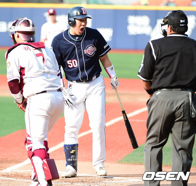 1회초 두산 공격 1사 1루 상황 김현수가 삼진을 당한 뒤 아쉬워하고 있다.
