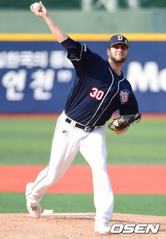 두산 선발 볼스테드가 힘차게 공을 뿌리고 있다.