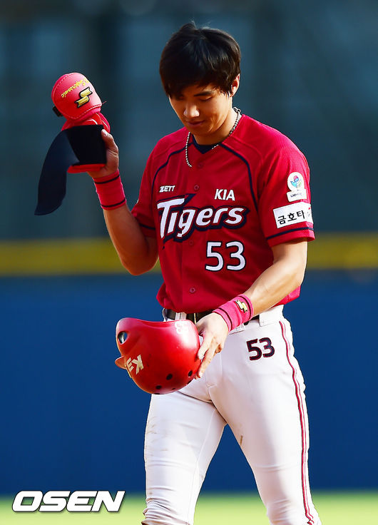 6일 오후 서울 잠실야구장에서 열린 2014 한국야쿠르트 세븐 프로야구 LG 트윈스와 KIA 타이거즈의 경기, 2회초 1사 주자 만루 KIA 이대형이 투수 앞 병살타로 이닝을 마친 후 아쉬워하고 있다.
