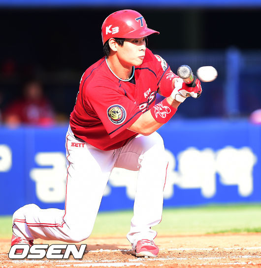 6일 오후 서울 잠실야구장에서 열린 2014 한국야쿠르트 세븐 프로야구 LG 트윈스와 KIA 타이거즈의 경기, 2회초 무사 주자 1,2루 KIA 백용환이 번트를 시도, 야수 선택으로 출루하며 무사 만루가 되고 있다.