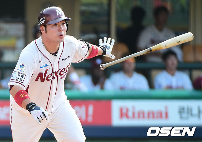 2회말 넥센 공격 선두타자로 나선 박병호가 우측 펜스를 맞히는 2루타를 날리고 있다.