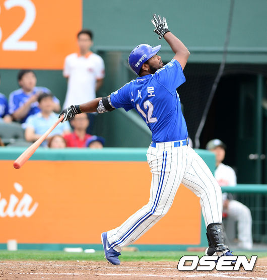 2회초 1사 만루에서 삼성 나바로가 희생플라이를 날리고 타구를 바라보고 있다.