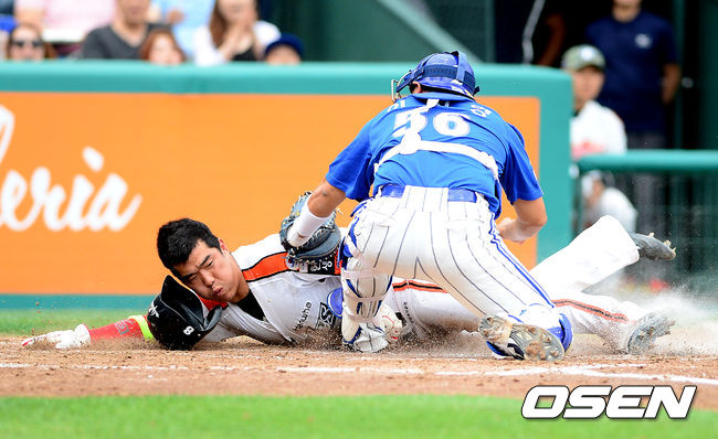2회말 1사 1루에서 한화 정근우가 최진행의 2루타에 홈에서 삼성 이지영에 태그아웃 당하고 있다.
