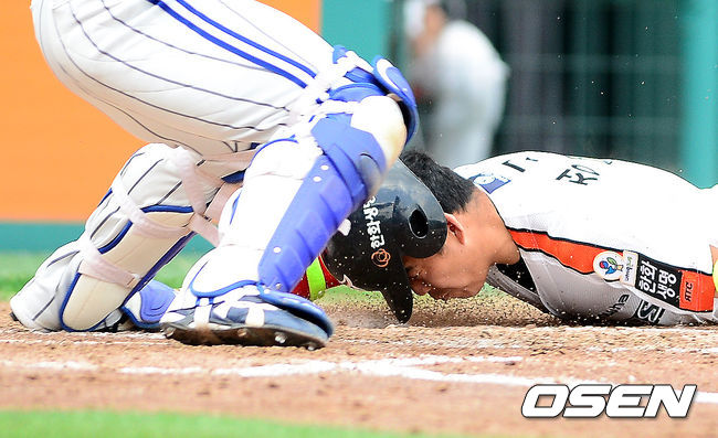 2회말 1사 1루에서 한화 정근우가 최진행의 2루타에 홈에서 삼성 이지영에 태그아웃 당하고 있다.