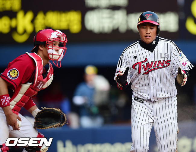 6일 오후 서울 잠실야구장에서 열린 2014 한국야쿠르트 세븐 프로야구 LG 트윈스와 KIA 타이거즈의 경기, 4회말 1사 주자 2,3루 LG 김용의의 내야 땅볼타구때 3루 주자 채은성이 홈에서 세이프 되며 박수를 치고 있다.