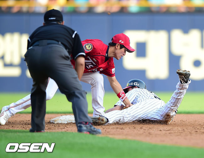 6일 오후 서울 잠실야구장에서 열린 2014 한국야쿠르트 세븐 프로야구 LG 트윈스와 KIA 타이거즈의 경기, 4회말 1사 주자 1,3루 LG 박용택의 타석에서 1루 주자 김용의가 2루 도루에 실패하고 있다.