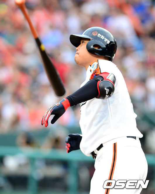 4회말 1사 2루에서 한화 최진행이 역전 투런포를 날리고 있다.
