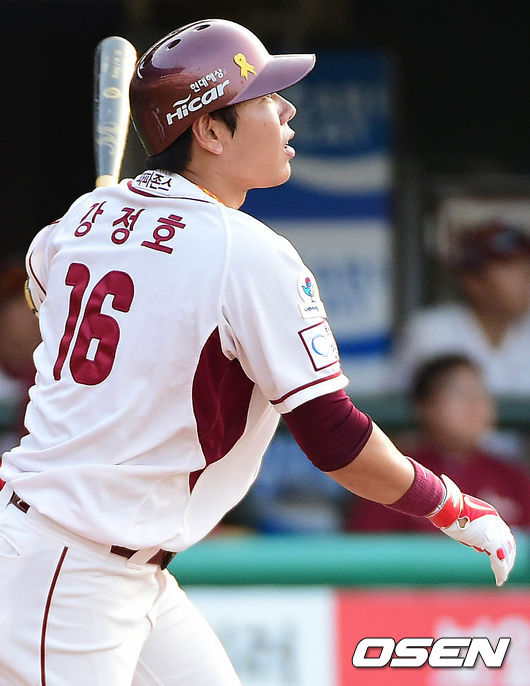 4회말 넥센 공격 1사 1루 상황 강정호가 좌월 투런포를 날리고 타구를 바라보고 있다.