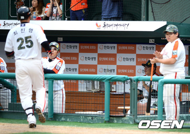 4회말 1사 2루에서 한화 최진행이 역전 투런포를 날리자 김응룡 감독이 더그아웃에서 박수를 치고 있다.
