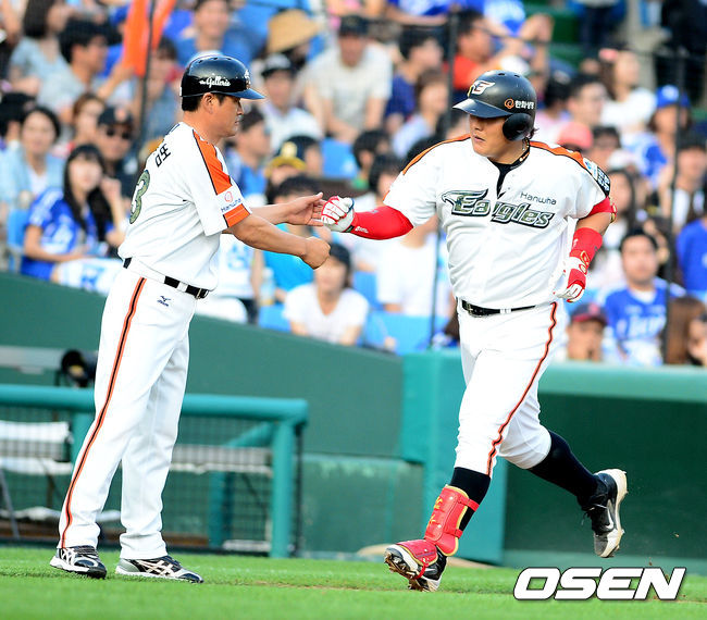 5회말 2사 2루에서 한화 김태균이 투런포를 날리고 이종범 코치와 하이파이브를 하고 있다.